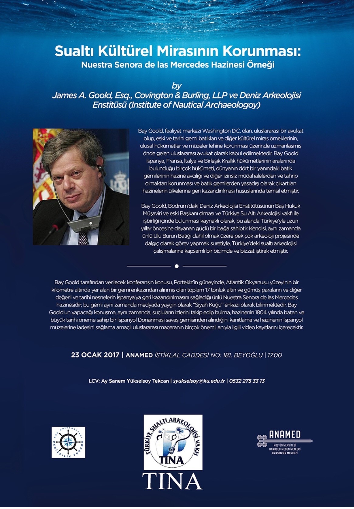 Bay Goold tarafından verilecek konferansın konusu, Portekiz'in güneyinde, Atlantik Okyanusu yüzeyinin bir kilometre altında yer alan bir gemi enkazından alınmış olan toplam 17 tonluk altın ve gümüş paralann ve diğer değerli ve tarihi nesnelerin ispanya'ya geri kazandırılmasını sağladığı ünlü Nuestra Senora de las Mercedes hazinesidir, bu gemi aynı zamanda medyada yaygın olarak "Siyah Kuğu" enkazı olarak bilinmektedir. Bay Goold'un yapacağı konuşma, aynı zamanda, suçluların izlerini takip edip bulma, hazinenin 1804 yılında batan ve büyük tarihi öneme sahip bir ispanyol Donanması savaş gemisinden alındığını kanıtlama ve hazinenin ispanyol müzelerine iadesini sağlama amaçlı uluslararası maceranın birçok önemli anıyla ilgili video kayıtlannı içerecektir.