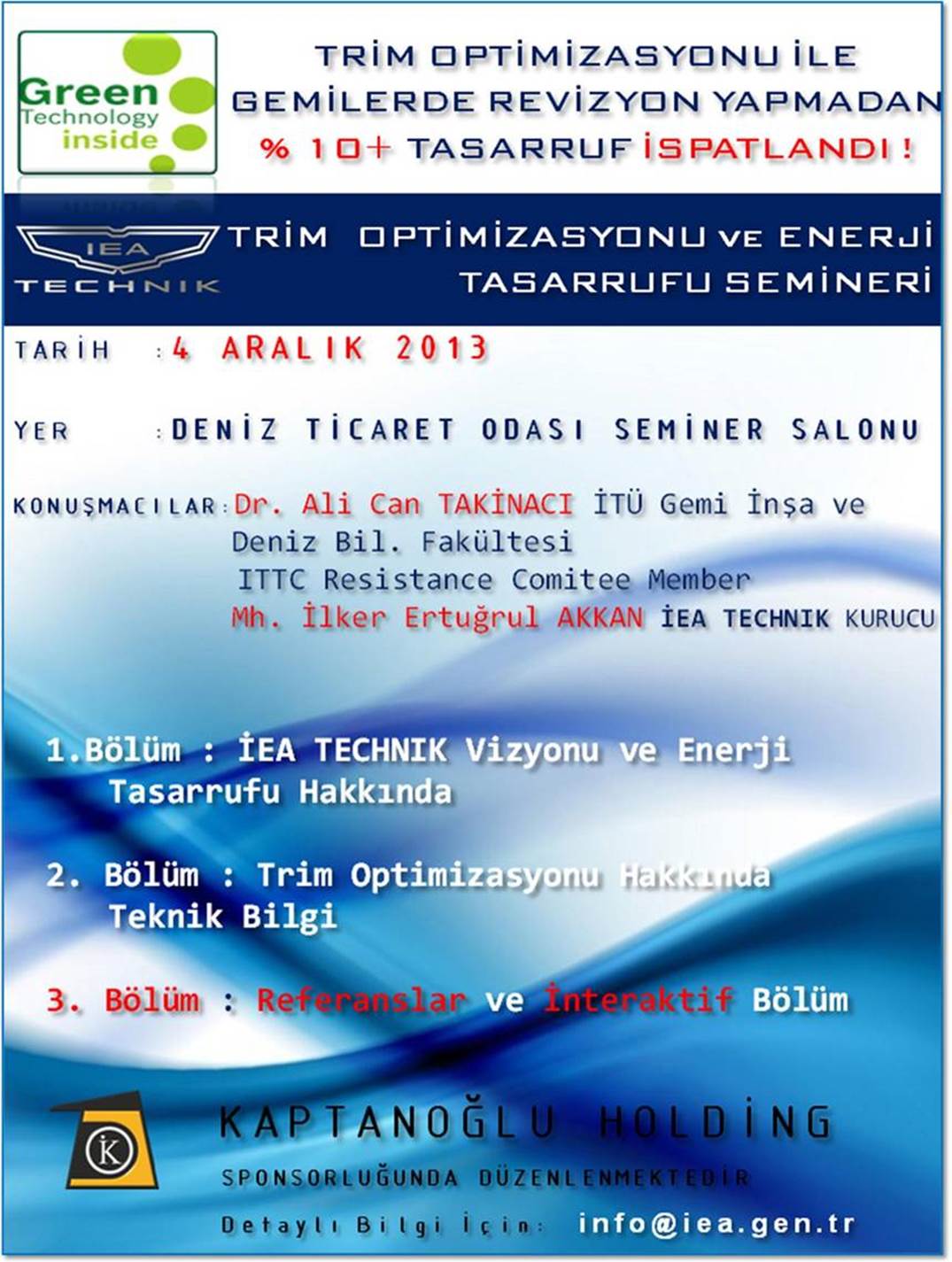 Trim Optimizasyonu ve Enerji Tasarrufu Semineri Kaptanoğlu Holding sponsorluğundan 4 Aralık 2013 günü 15:00- 17:30 saatleri arasında Deniz Ticaret Odası Seminer Salonunda yapılacaktır. Konuşmacılar Dr.Ali Can TAKİNACI (İTÜ Gemi İnşa ve Deniz Bilimleri Fakültesi ITTC Resistance Comitee Member ve Mh.ilker ERTUĞRUL AKKAN (İEA Technik Kurucu)'dır.