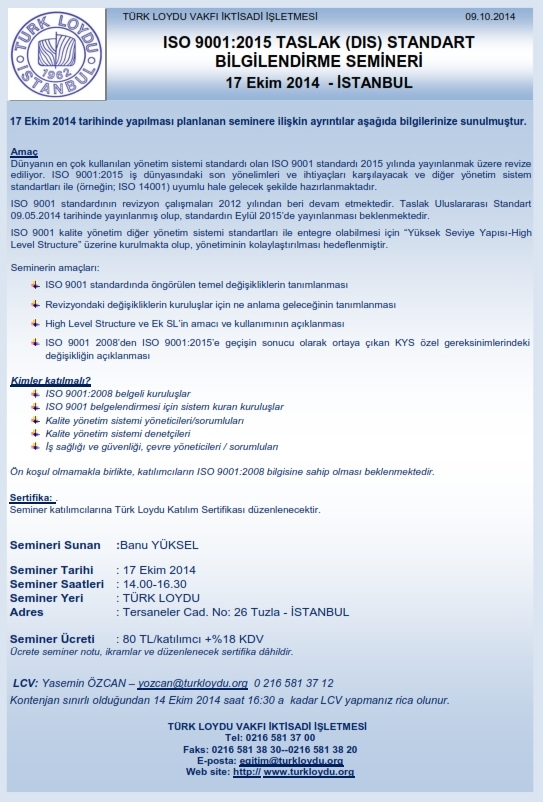 Türk Loydu tarafından 17 Ekim 2014 tarihinde gerçekleştirilecek olan “ISO 9001:2015 Taslak (Dış) Standart Bilgilendirme Semineri” hakkında alınan duyuru Ek’lidir.